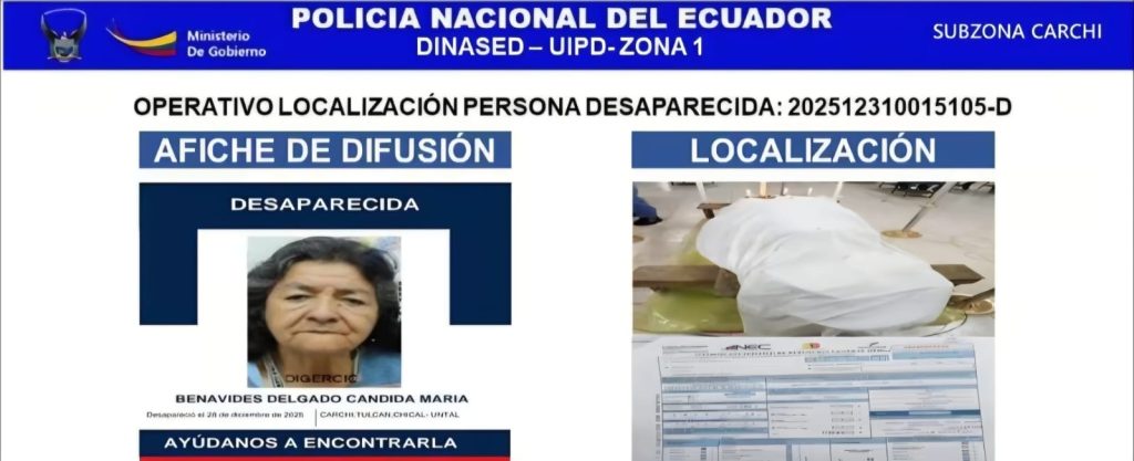 Dos personas que habían sido reportadas como desaparecidas fueron localizadas sin vida en distintos sectores de la parroquia El Chical, en el cantón Tulcán, en hechos ocurridos entre finales de diciembre de 2025 e inicios de enero de 2026, según información confirmada por la Dirección Nacional de Delitos contra la Vida, Muertes Violentas, Desapariciones, Extorsión y Secuestros (Dinased) de Carchi.