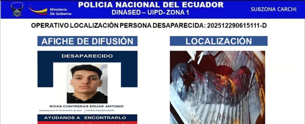 El primer caso corresponde a Eduar Antonio Rivas Contreras, de 20 años, de nacionalidad venezolana, quien fue hallado sin vida en el río, en el sector de Guare, comunidad Angostura. De acuerdo con el reporte policial, el joven había desaparecido la noche del 27 de diciembre de 2025, alrededor de las 21h00, cuando intentaba cruzar un río fronterizo desde territorio colombiano hacia Ecuador y perdió estabilidad, cayendo al afluente.